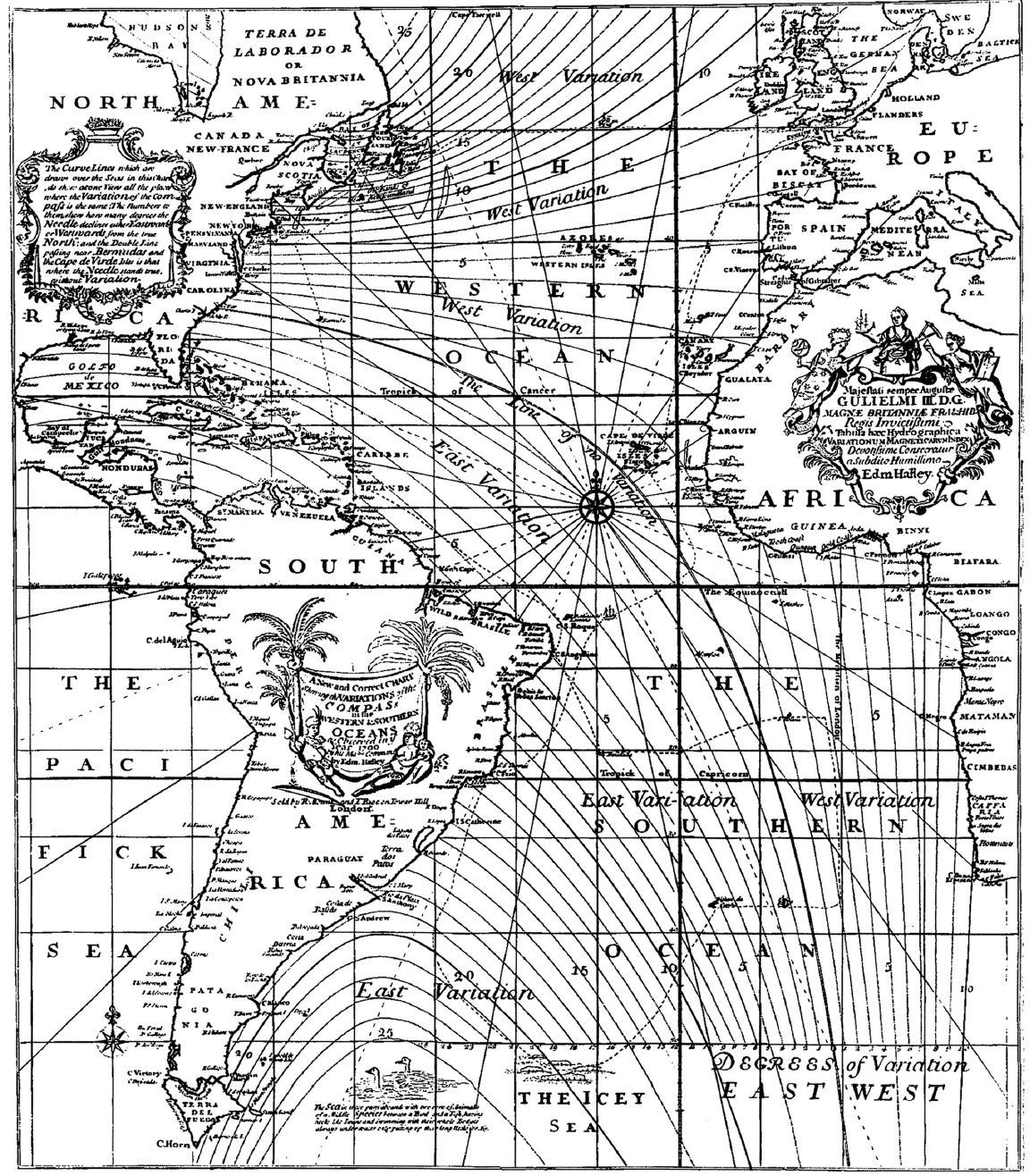 Edmond Halley’s 1701 ‘Atlantic Map’, the first global geomagnetic chart, made for marine navigation and formed the scientific foundation of geophysical methods now used in mineral exploration.